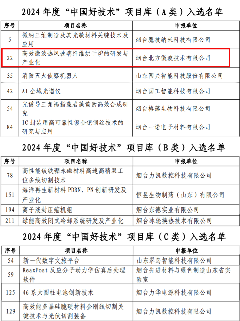 煙臺北方微波技術(shù)有限公司憑借“高效微波熱風(fēng)玻璃纖維烘干爐的研發(fā)與產(chǎn)業(yè)化”項(xiàng)目,從眾多參評技術(shù)中脫穎而出,成功入選“中國好技術(shù)”A類項(xiàng)目庫,彰顯了其在工業(yè)微波能應(yīng)用領(lǐng)域的卓越創(chuàng)新實(shí)力。